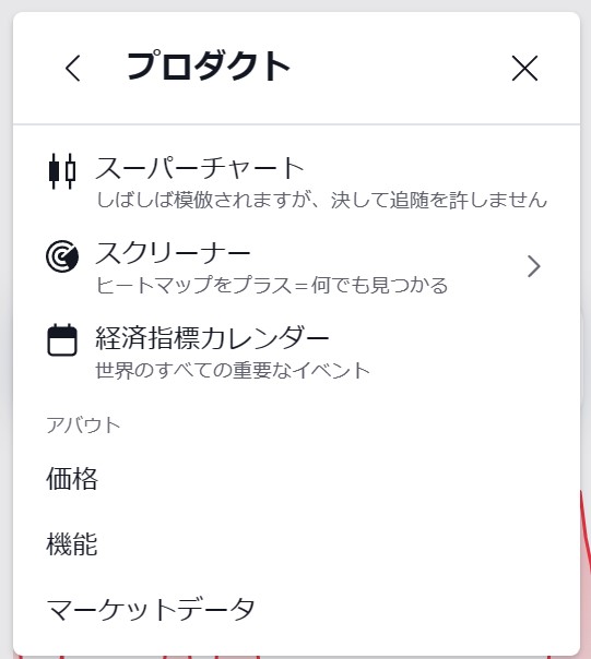 パソコンの環境によってホームページのレイアウトが少し変わることもあるみたいですが、左上、または上中央付近にメニューアイコンがあります。日本人にはカタカナの「フン」に見えてしまいますが、これはアルファベットの大文字の「TV」のデザインフォントです。その「TV」ロゴのすぐ左にメニューアイコンが見えるはずです。メニューアイコンを開いて「プロダクト」を選び、「スーパーチャート」を選択しましょう。