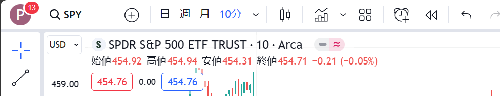 ●虫めがねマークに「SPY」と表示されている部分で、表示する銘柄を指定します。「SPY」はS&P500インデックスとほぼ連動するETF銘柄で、S&P500の全銘柄を一つの株のように売買できます。ここにティッカーシンボルや株式コードを入力します。例えば「AAPL」と入力するとAppleの株価チャートが表示され、「7203」と入力するとトヨタ自動車の株価チャートが表示されます。「USDJPY」のようにFXチャートを表示することもできます。