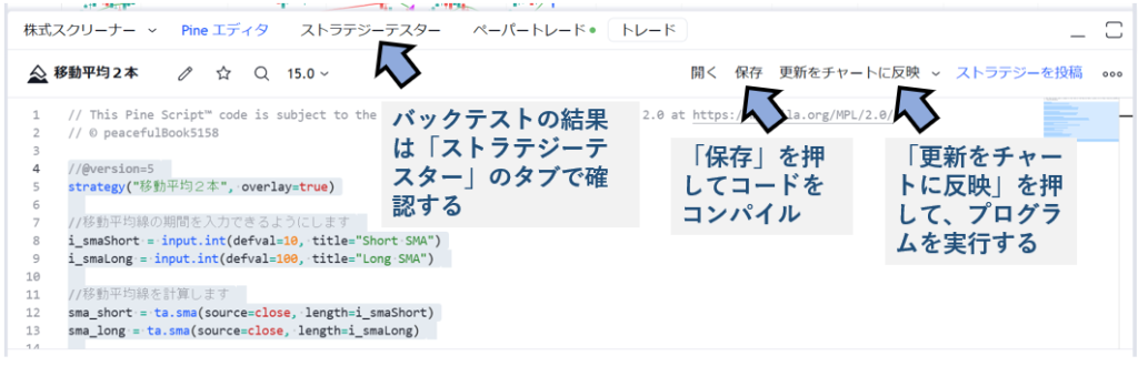 「チャートに追加」または「更新をチャートに反映」を押すと、チャートに上記コードが反映され、バックテストが実行されます。